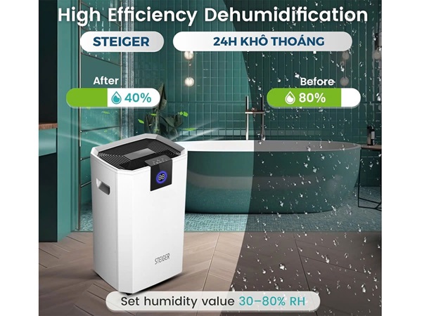 Máy hút ẩm Steiger STG-855BW là một lựa chọn tuyệt vời để giữ cho không gian sống của bạn khô ráo và thoải mái. Với công suất hút ẩm mạnh mẽ lên đến 55 lít mỗi ngày, máy có thể xử lý hiệu quả độ ẩm dư thừa trong không khí, ngăn ngừa sự phát triển của nấm mốc và vi khuẩn, đồng thời bảo vệ đồ đạc và thiết bị điện tử khỏi hư hại do ẩm ướt.
