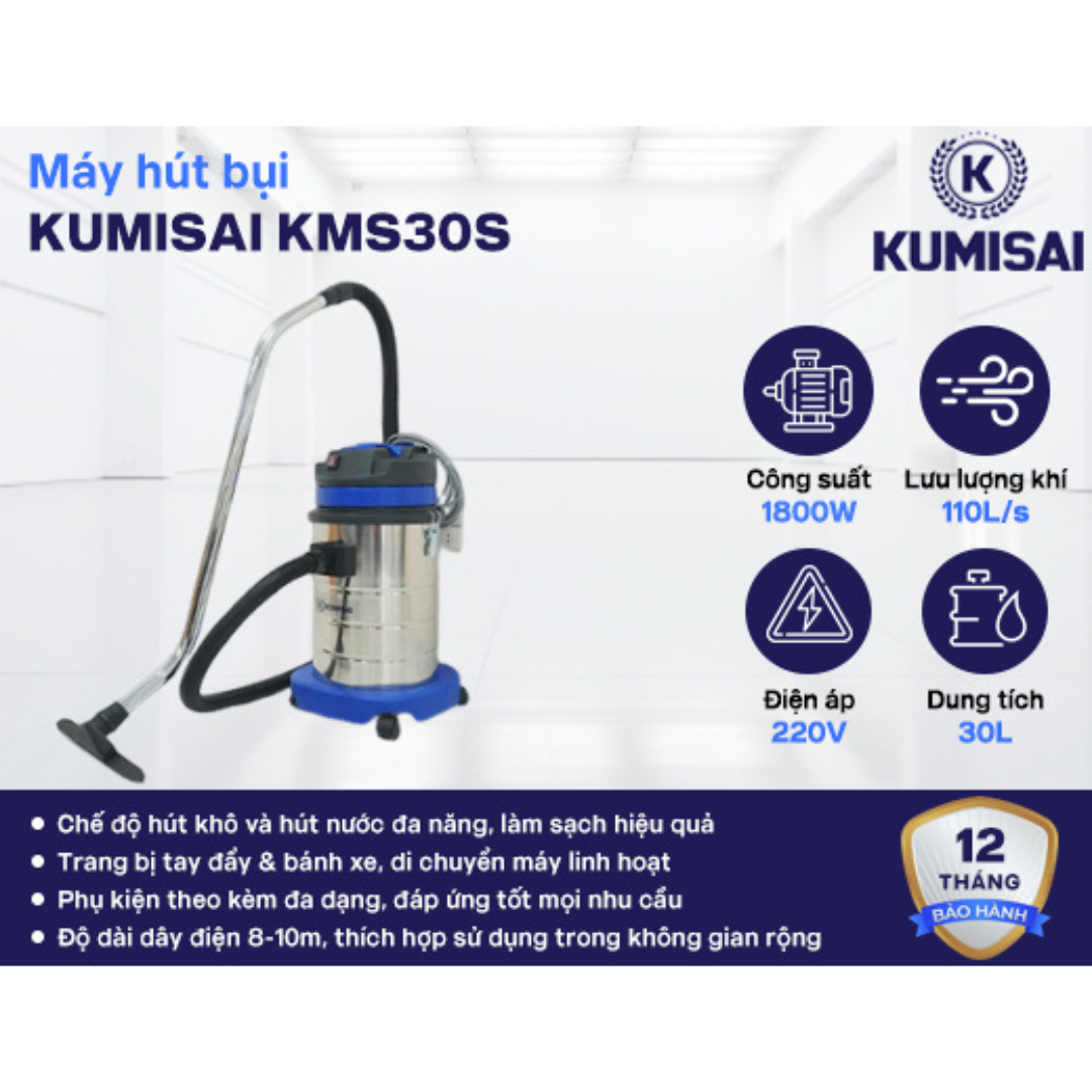 Máy hút bụi nhà xưởng Kumisai KMS30S là lựa chọn hiệu quả cho doanh nghiệp và cơ sở sản xuất cần thiết bị vệ sinh công nghiệp mạnh mẽ, vận hành ổn định và dễ sử dụng, giúp duy trì môi trường làm việc sạch sẽ, an toàn và chuyên nghiệp.