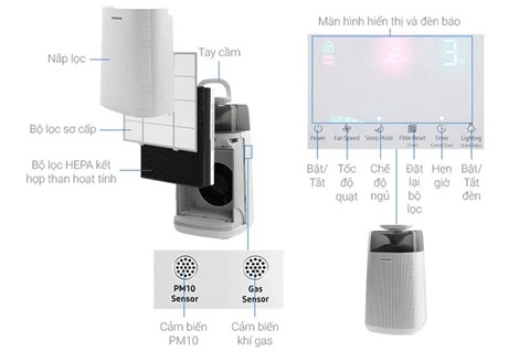 - Cảm biến bụi và khí: Máy được trang bị cảm biến bụi và khí, giúp tự động điều chỉnh chế độ hoạt động phù hợp với chất lượng không khí.