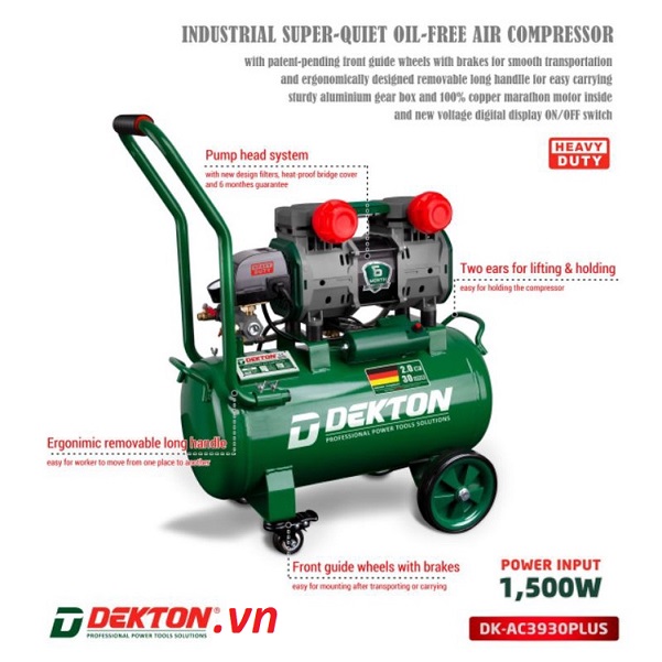 Máy nén khí Dekton không dầu 3930 PLUS 2HP – 30 lít là lựa chọn đáng tin cậy cho người dùng cần thiết bị nén khí bền bỉ, khí sạch và hiệu suất cao, phục vụ đa dạng nhu cầu sử dụng trong công việc và sinh hoạt.