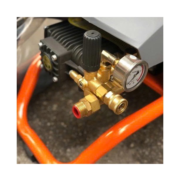 Cụm chỉnh áp và đồng hồ đo: Trên thân máy tích hợp đồng hồ hiển thị áp suất thực tế và núm vặn điều chỉnh. Bạn có thể hạ áp để tưới cây, rửa kính hoặc tăng áp tối đa để rửa gầm xe, sàn nhà.